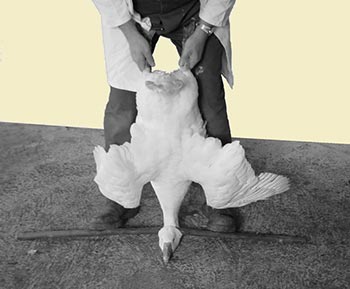 Hold the bird by the legs (and wing tips if possible), with the head and neck on the ground. An assistant should place a heavy stick (or metal bar) across the neck, behind the head. The person holding the legs should then apply firm pressure to the bar either side of the head and immediately pull the bird’s body upwards using sufficient force to dislocate the neck (this may cause some bleeding).